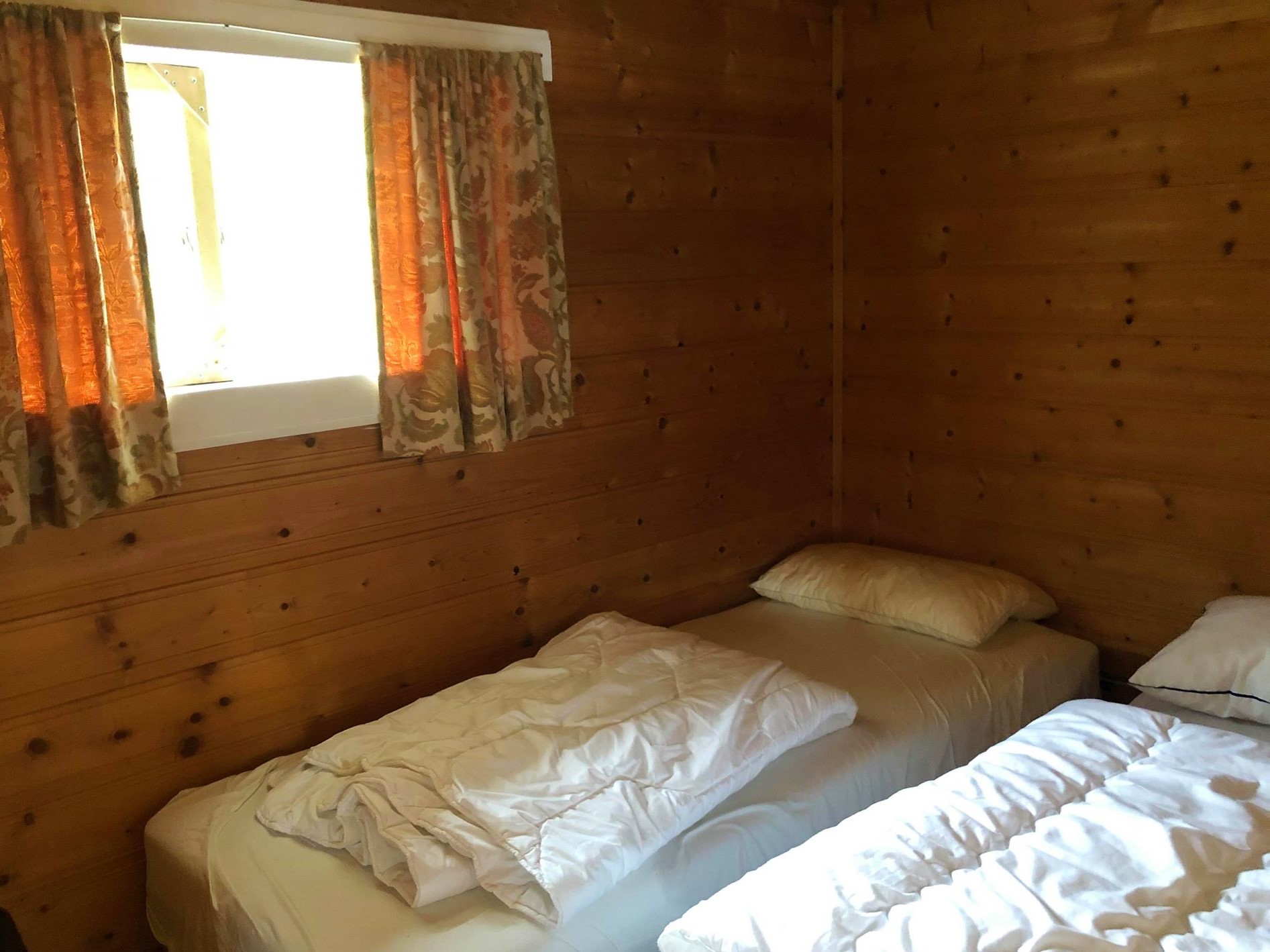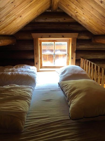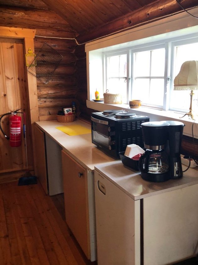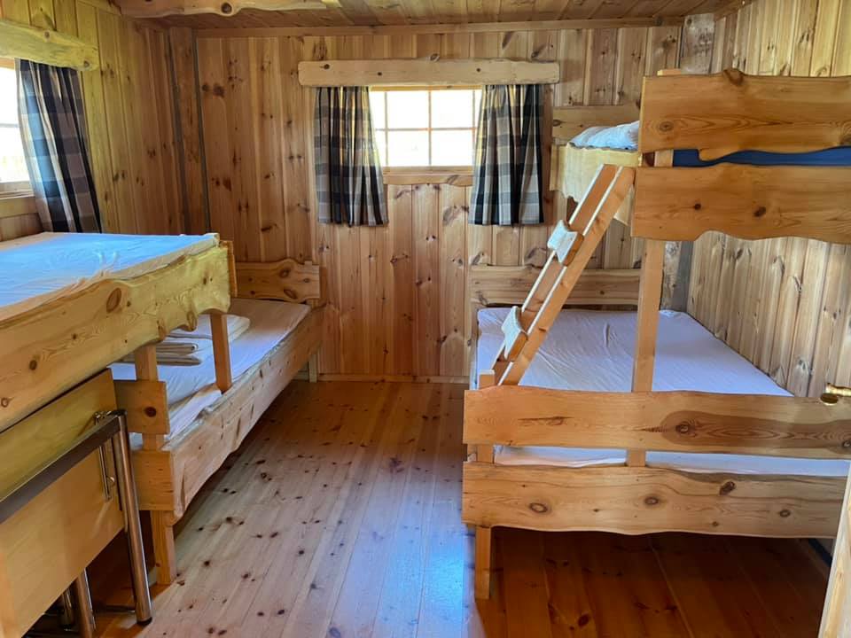 Det er tilgang på bad med dusj og toalett (deles ikke med andre) i nabobygg, ca 40 m unna. To soverom med 5 sengeplasser i hvert rom, med puter og dyner.