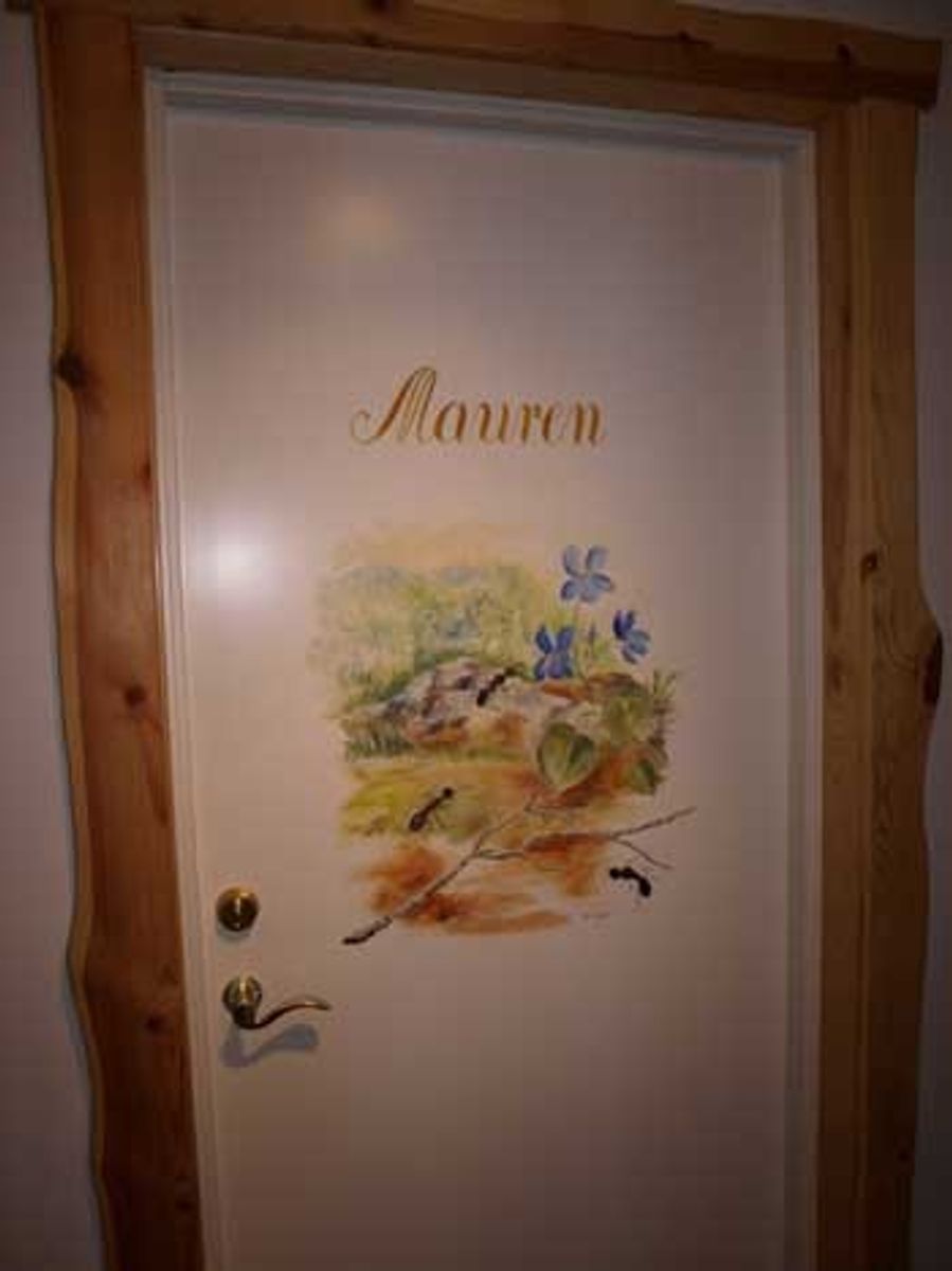 Dørene i skogshotellet er dekorert av tre lokale kunstnere fra Årnes, Tove Løvaas, Mette Smedstad Hansen og Mari Aasli. Mari har bl.a. malt en fin maur-dør! Takhimlingen i brudesuiten er håndmalt av eierenes datter Cecilie.