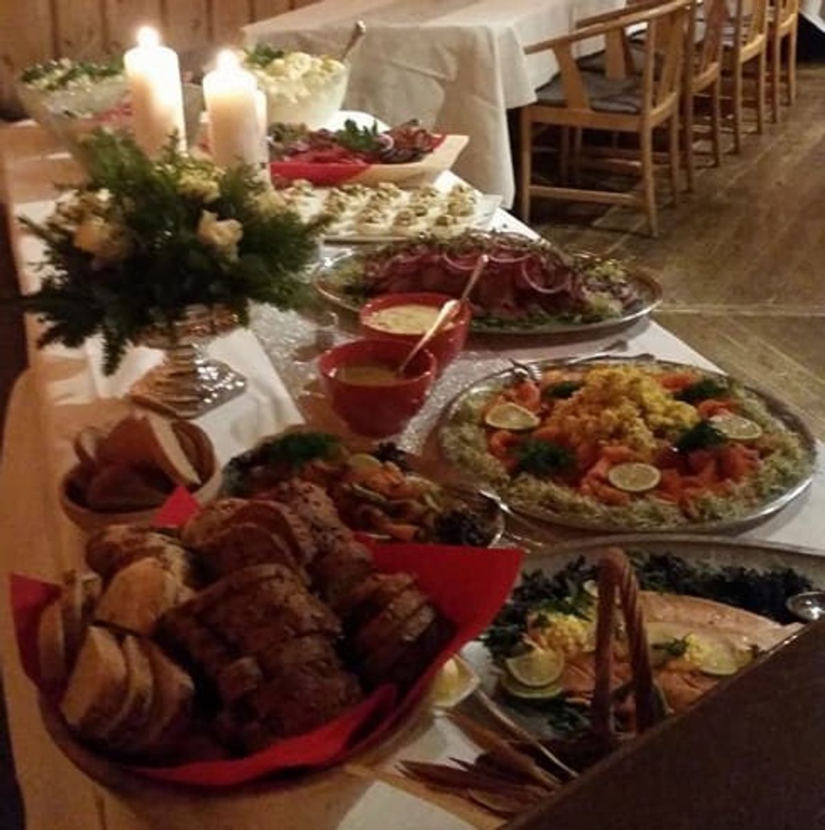 - Salat, dressing, brød og smør følger med koldtbordet.